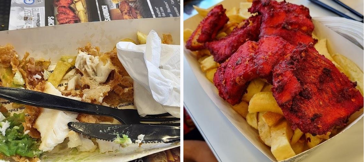 Traditional fish and chips. Crispy batter with lots of Crispy bits on top the fish. Mrs got the spicy fish which was very nice, not too spicy just a little heat. Chips were proper chippy chips. Best of all it wasn't at all greasey. Had both spicy and normal curry sauce, both are very good.